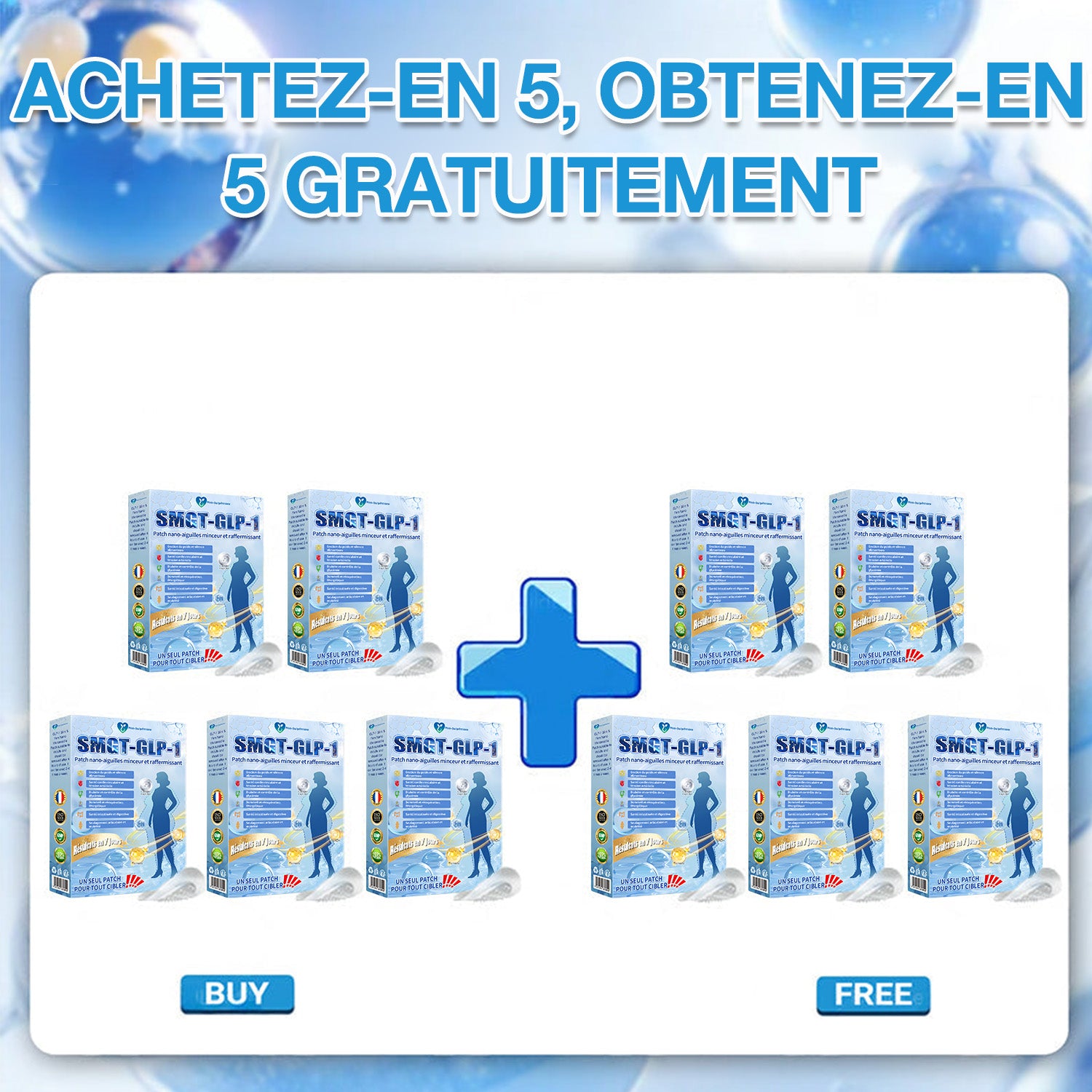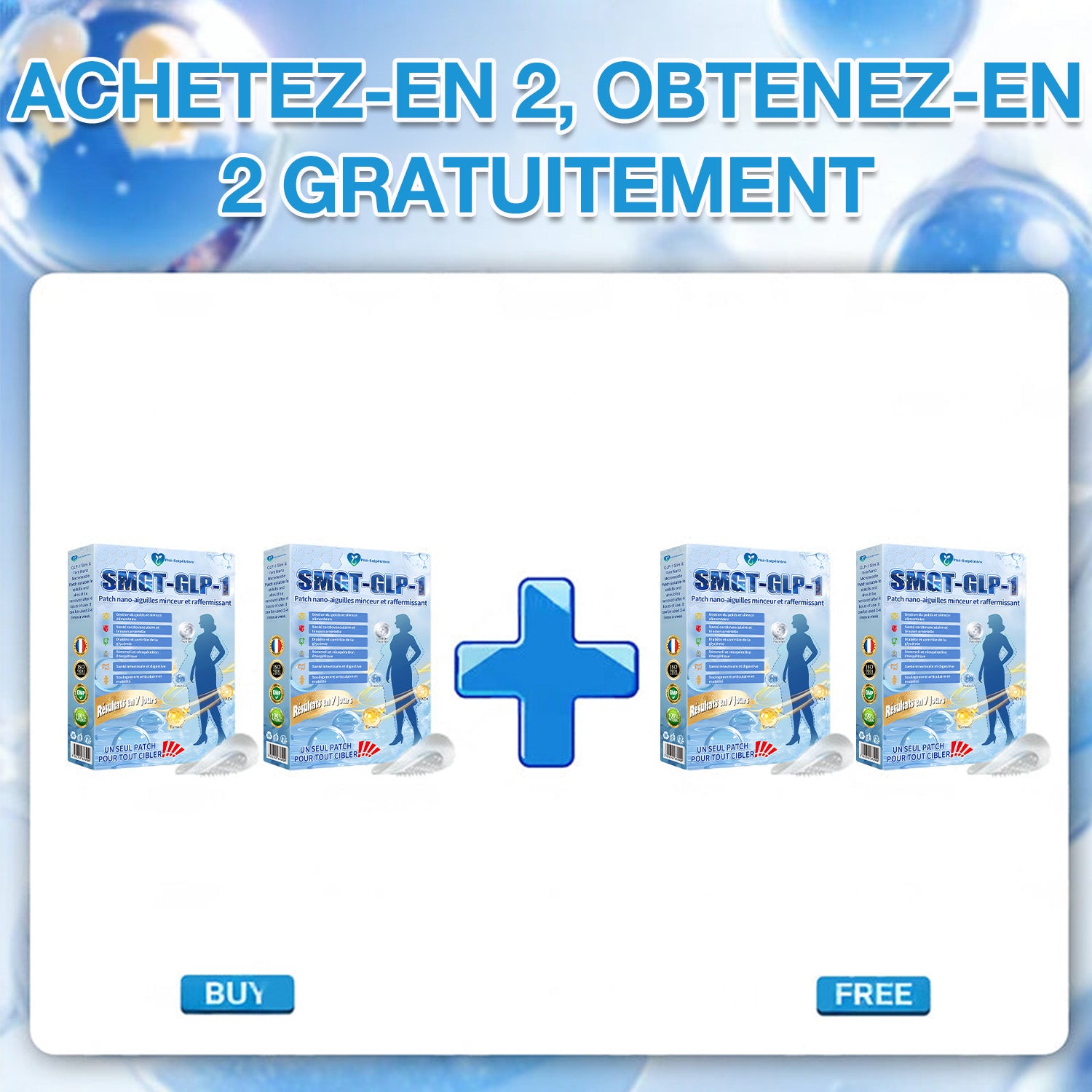 Approuvé par l’ANSM et cliniquement prouvé, ce patch non invasif combine la technologie SMGT-GLP-1 avec le NAD+, le curcuma et le Matrixyl 3000 pour brûler les graisses, équilibrer la glycémie, stimuler le métabolisme, soulager les articulations, renforcer les os, raffermir et tonifier la peau, et favoriser l’anti-âge. Il libère ses actifs en profondeur dans la peau afin de réguler l’insuline, inhiber le glucagon et ralentir la vidange gastrique — sans médicaments, sans injections et sans effets secondaires.